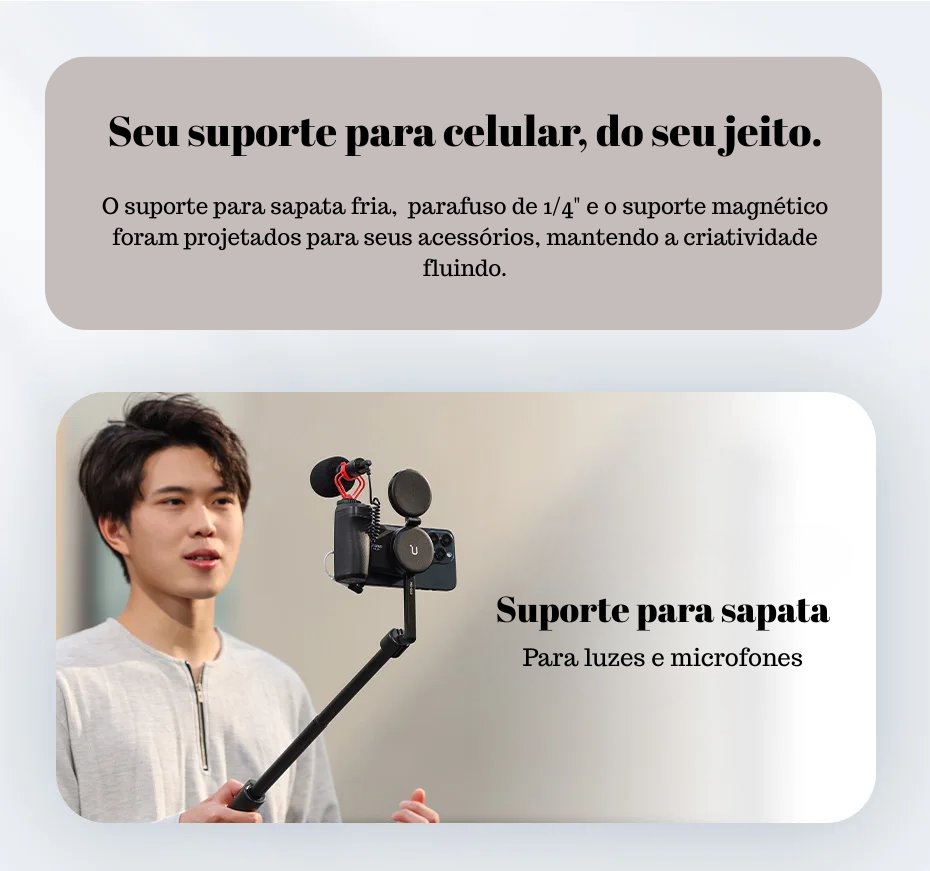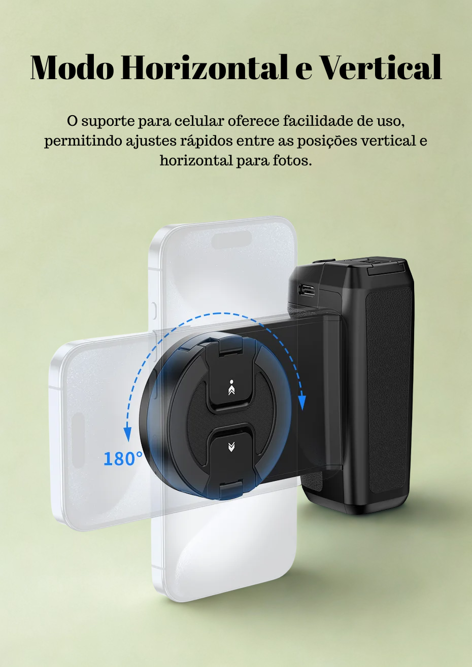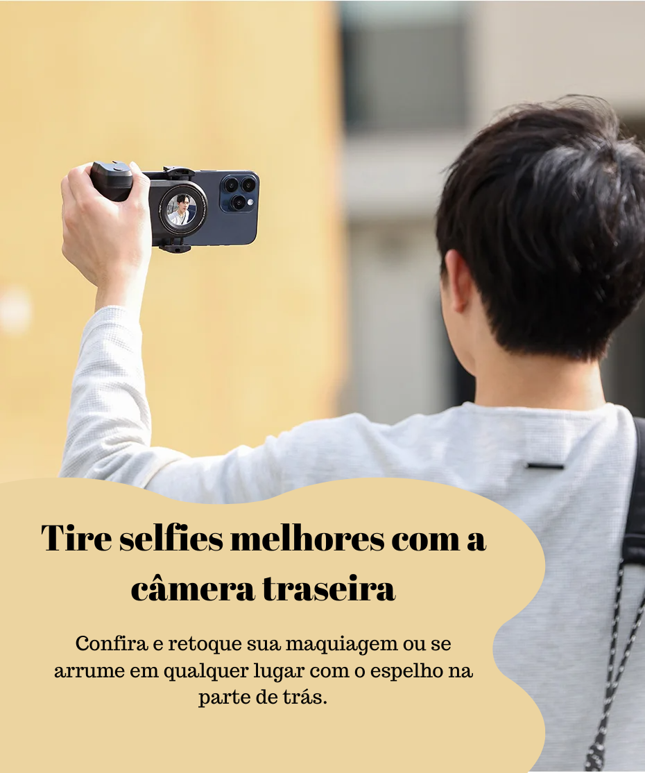 O encaixe MagSafe garante estabilidade e permite girar o celular facilmente para capturas na horizontal ou vertical — perfeito para fotos, vídeos, reels, lives e vlogs.