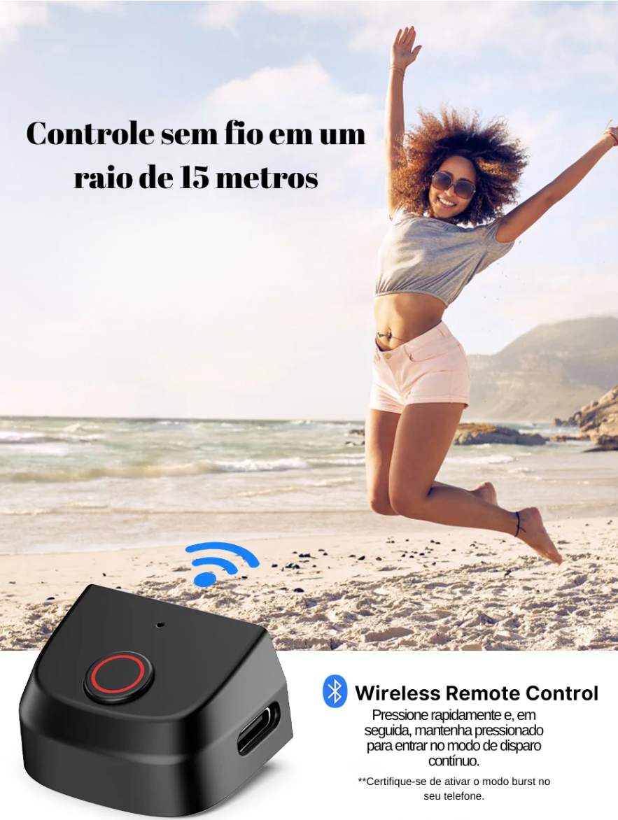 Além disso, o botão de obturador Bluetooth integrado traz ainda mais liberdade! Com um simples toque, você fotografa ou inicia a gravação sem precisar encostar no celular. Isso significa mais precisão, zero tremores e muito mais praticidade.